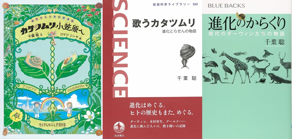 左から『総天然色自然科学漫画 カタツムリ小笠原へ』、『歌うカタツムリ 進化とらせんの物語』、『進化のからくり 現代のダーウィンたちの物語』。これらの本に千葉自身の失策によって父島固有のカタツムリを絶滅させてしまったという事実は一言も書かれていない。